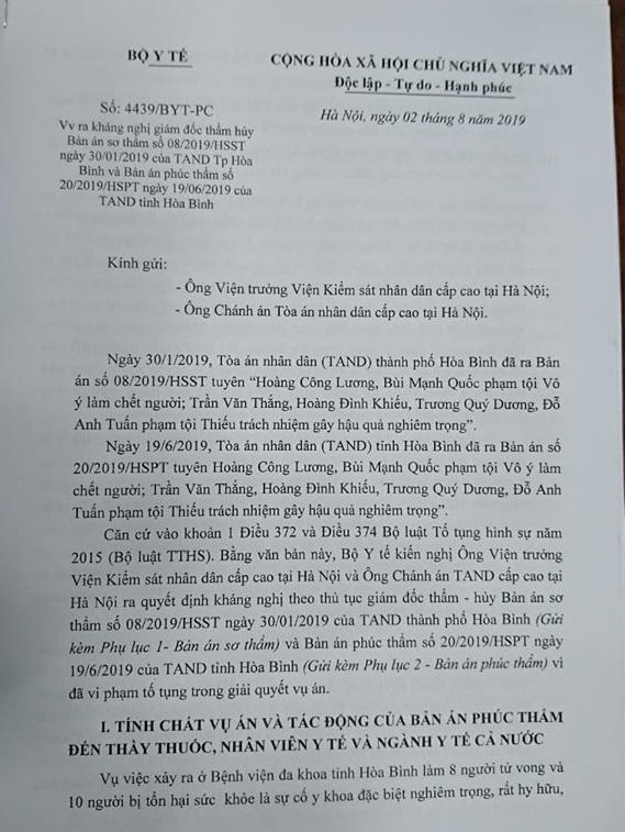 Ngày 2/8/2019, Bộ Y tế đã ban hành văn bản số 4439/BYT-PC v/v ra kháng nghị giám đốc thẩm hủy Bản án sơ thẩm số 08/2019/HSST ngày 30/1/2019 của TAND TP Hòa Bình và Bản án Phúc thẩm số 20/2019/HSPT ngày 19/6/2019 của TAND tỉnh Hòa Bình.