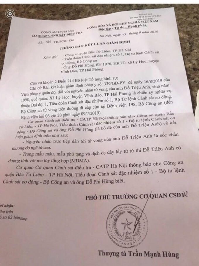 Cơ quan CSĐT công an thành phố Hà Nội thông báo cho Công an quận Bắc Từ Liêm, Tiểu đoàn Cảnh sát đặc nhiệm số 1, Bộ Tư lệnh cảnh sát cơ động, Bộ Công an và ông Đỗ Phi Hùng (là bố đẻ của anh Đỗ Triệu Anh) về kết quả giám định trên như sau: