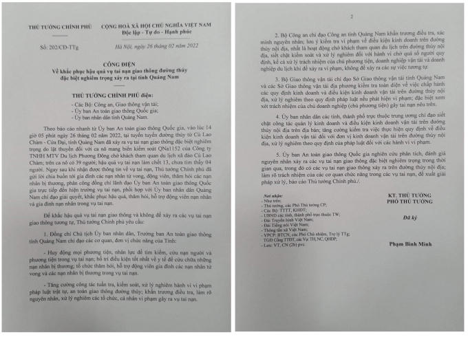 Chiều ngày 26/2, Thủ tướng Chính phủ Phạm Minh Chính đã gửi Công điện số 202/CĐ-TTg đến Bộ Công an, Bộ Giao thông Vận tải, Uỷ ban ATGT Quốc gia và UBND tỉnh Quảng Nam để chỉ đạo việc khắc phục hậu qủa đối với vụ chìm cano tại tuyến đường thủy từ Cù Lao Chàm - Cửa Đại, tỉnh Quảng Nam.