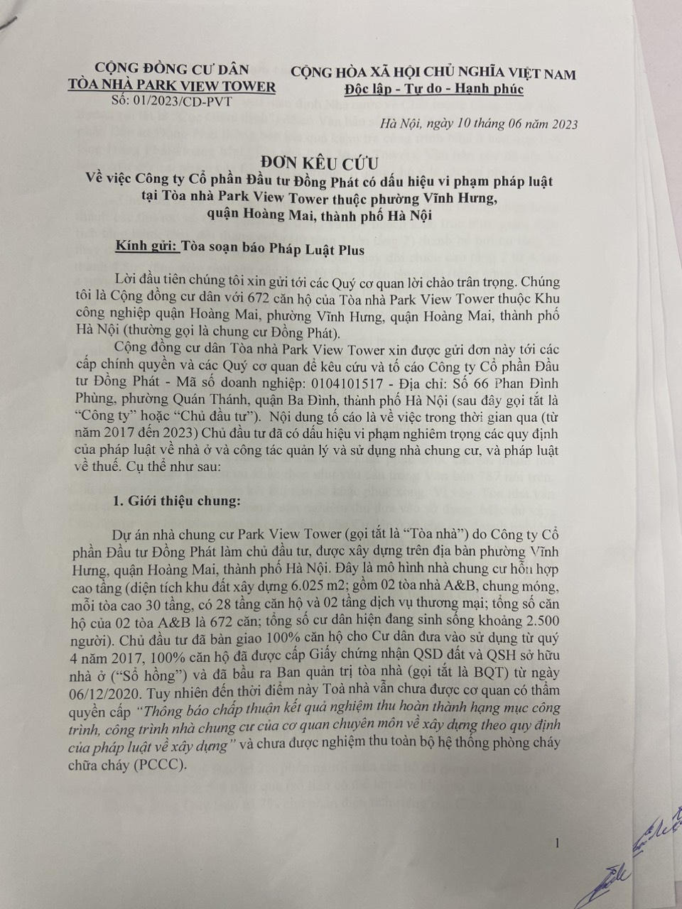 Liên quan đến sự việc cư dân Tòa nhà Park View Tower (còn được gọi là chung cư Đồng Phát) do Công ty Cổ phần Đầu tư Đồng Phát làm chủ đầu tư, phản ánh hàng loạt sai phạm nghiêm trọng trong thời gian đưa vào sử dụng. Trong đó, dù đã thành lập Ban quản trị, nhưng Chủ đầu tư Đồng phát không bàn giao quỹ bảo trì 2% mà Pháp luật Plus đã thông tin.