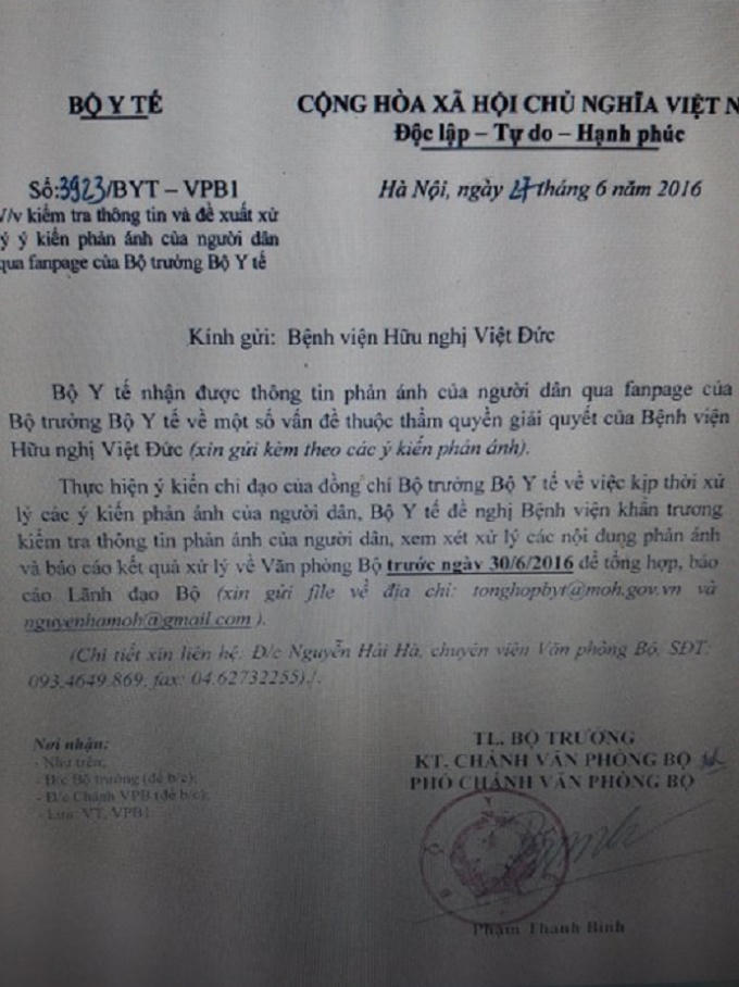 Cụ thể trong công văn số 3923/BYT –VPB1 do ông Phạm Thanh Bình - Phó chánh văn phòng Bộ Y tế thừa lệnh của Bộ trưởng Bộ Y tế ký đã nêu rõ: “Thực hiện ý kiến chỉ đạo của đồng chí Bộ trưởng Bộ Y tế về kịp thời xử lý các ý kiến phản ánh của người dân. Bộ Y tế nhận được thông tin phản ánh của người dân trên fanpage của Bộ trưởng Bộ Y tế về một số vấn đề thuộc thẩm quyền giải quyết của bệnh viện hữu nghị Việt Đức”.