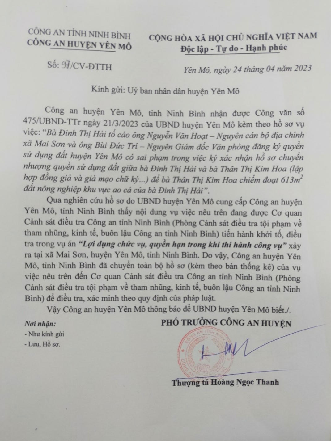 Theo đó, Công an huyện Yên Mô, tỉnh Ninh Bình nhận được công văn số 475/UBND-TTr ngày 21/3/2023 của UBND huyện Yên Mô kèm theo hồ sơ vụ việc: “ Bà Đinh Thị Hải tố cáo ông Nguyễn Văn Hoạt - nguyên cán bộ địa chính xã Mai Sơn và ông Bùi Đức Trí - nguyên Giám đốc văn phòng đăng ký QSDĐ huyện Yên Mô có sai phạm trong việc ký xác nhận hồ sơ chuyển nhượng QSDĐ giữa bà Đinh Thị Hải và bà Thân Thị Kim Hoa ( lập Hợp đồng giả và giả mạo chữ ký...) để bà Hoa chiếm đoạt 613m2 đất nông nghiệp khu vực Ao cá của bà Đinh Thị Hải”.