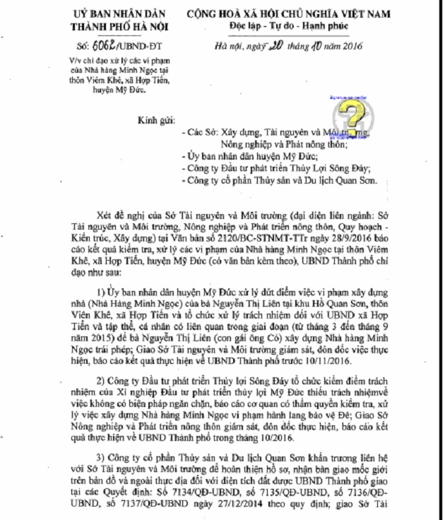 Theo đó, văn bản số 6062/UBND-ĐT ngày 20/10/2016 của UBND TP Hà Nội về việc xử lý các vi phạm của Nhà hàng Minh Ngọc ghi rõ: Xét đề nghị của Sở Tài nguyên và Môi trường (đại diện liên ngành: Sở TN&MT; NN&PTNT, sở Quy hoạch và Kiến trúc, Xây dựng) tại Văn bản số 2120/BC-STNMT-TTr ngày 28/9/2016 báo cáo kết quả kiểm tra, xử lý các vi phạm của Nhà Hàng Minh Ngọc (tại thôn Viêm Khê, xã Hợp Tiến, huyện Mỹ Đức, UBND TP có chỉ đạo sau.