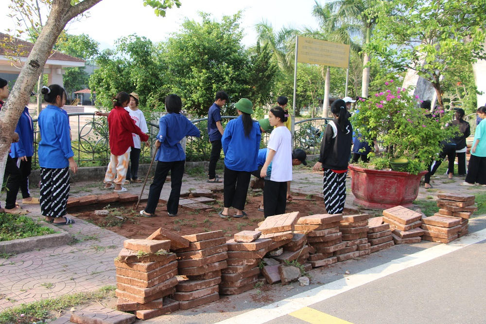Các em học sinh tham gia lao động dưới thời tiết nắng nóng.