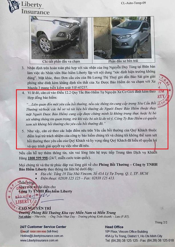Văn bản của Bảo hiểm Liberty viện dẫn: “Điều 12.2 Quy tắc bảo hiểm tự nguyện xe cơ giới đính kèm theo Hợp đồng bảo hiểm: “… Liên quan đến một yêu cầu bồi thường, nếu các thông tin cung cấp trong Yêu cầu bồi thường và/hoặc các hồ sơ và tài liệu bồi thường do Người được bảo hiểm (hoặc thay mặt Người được bảo hiểm) cung cấp được chứng minh là không trung thực hoặc bị bỏ sót những thông tin quan trọng, trừ khi việc bỏ sót là do vô ý, Công ty bảo hiểm có quyền xem xét không bồi thường cho yêu cầu bồi thường đó”.