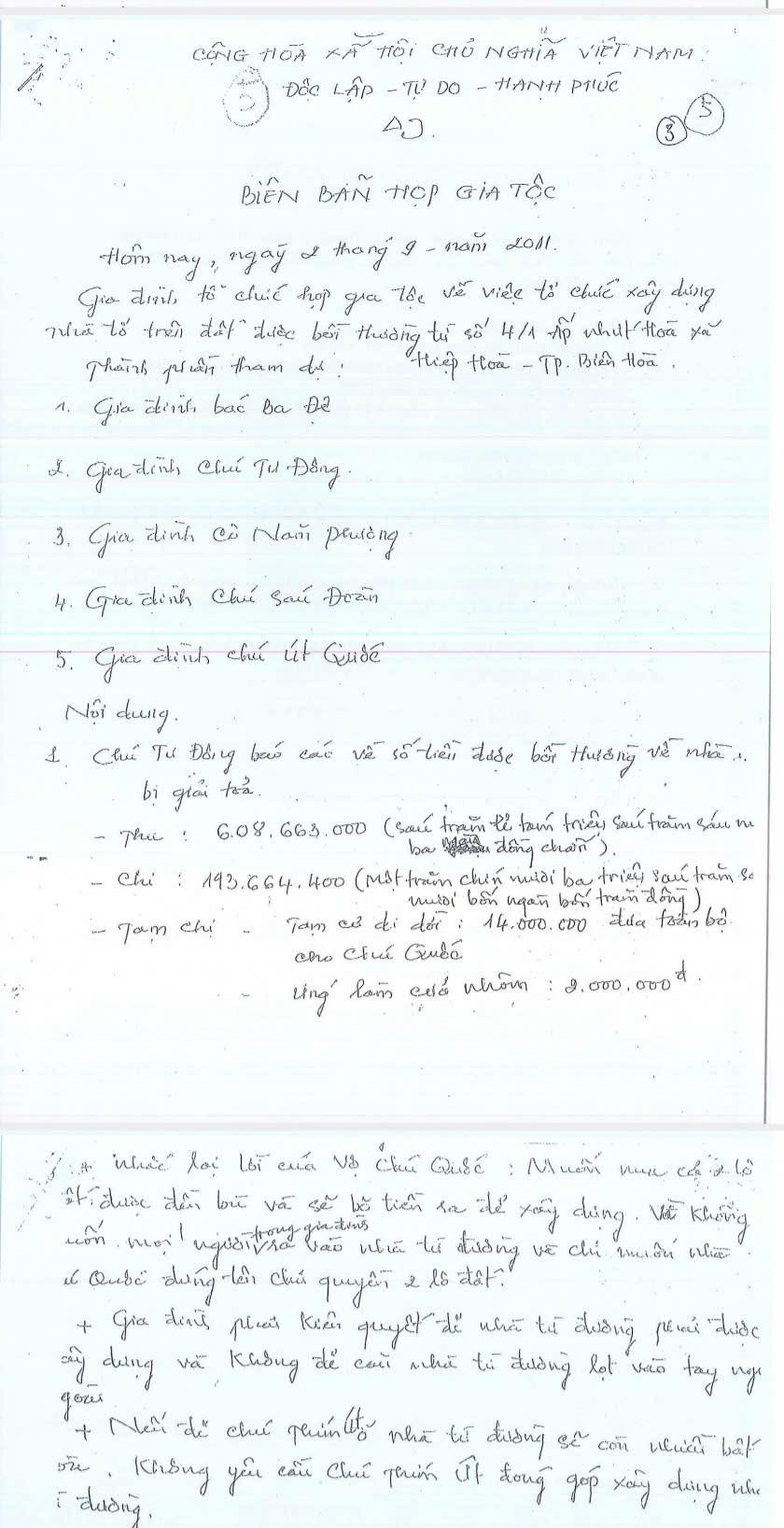 Sau khi nhận tiền bồi thường và đất, vào tháng 9/2011, năm anh em (bốn trai, một gái) đã cùng ngồi họp lại để đi đến thống nhất sử dụng phần tiền và đất trên. Theo Biên bản họp gia tộc, tất cả đã thống nhất sử dụng toàn bộ hai lô đất để xây nhà từ đường để thờ cúng ông bà, cha mẹ. Giao cho ông Đông - người em út – lo thủ tục pháp lý để xây nhà thờ tổ, sử dụng toàn bộ số tiền bồi thường để xây nhà, nếu còn thiếu anh em góp thêm. Thực tế anh em đã góp thêm gần 200 triệu đồng nữa. Sau hơn 3 tháng, từ đường xây xong, anh em vui vẻ đưa cha mẹ về đây để thờ cúng.