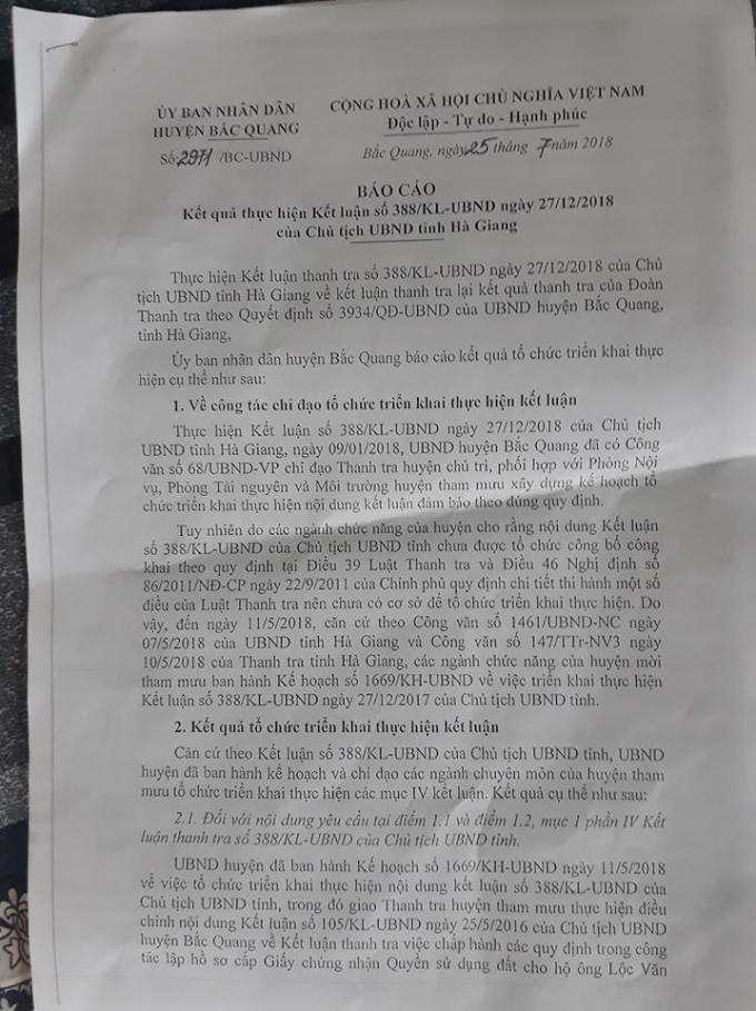 Trước đó, ngày 27/12/2017 UBND tỉnh Hà Giang đã ban hành công văn số 388/KL- UBND về việc thanh tra lại kết quả thanh tra của đoàn thanh tra theo quyết định 3934/ QĐ-UBND của UBND huyện Bắc Quang.