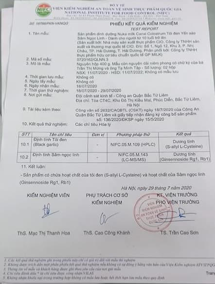 Kết quả kiểm nghiệm tại viện kiểm nghiệm quốc gia cho hơn 400 thùng sữa.