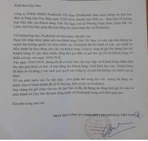 Sau khi Pháp luật Plus đăng tải thông tin thì ngày 27/2/2018, Công ty bảo hiểm Prudential đã có văn bản thông tin phản hồi, cụ thể như sau: "Ngay sau khi nhận được phản ánh của khách hàng Trần Thị Ngọc về việc cập nhật thông tin người thụ hưởng quyền lợi chưa chính xác, Prudential đã tiến hành rà soát, xác minh và điều chỉnh lại theo đúng yêu cầu của khách hàng. Công ty cũng đã gửi thư thông báo tới khách hàng về việc điều chỉnh, đồng thời gọi điện và gửi thư xin lỗi tới khách hàng về thiếu sót này vào ngày 10/1/2018.