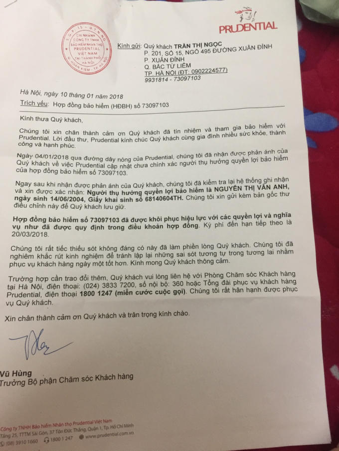 Trước đó như Phapluatplus.vn đã thông tin về vụ việc của chị Trần Thị Ngọc ở phường Xuân Đỉnh, quận Bắc Từ Liêm, TP Hà Nội phản ánh về vụ việc sai tên người thụ hưởng Bảo hiểm Prudential.