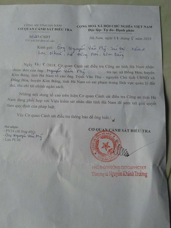 Được biết, ngày 7/5/2018, Cơ quan CSĐT - Công an tỉnh Hà Nam đã có Văn bản số 269/CSĐT về việc trả lời đơn tố cáo ông Trịnh Văn Thụ (nguyên Phó Bí thư, Chủ tịch UBND xã Đồng Hóa) có sai phạm trong lĩnh vực quản lý đất đai, thu - chi tài chính ngân sách gửi ông Nguyễn Văn Mỹ, trú tại xóm 2, thôn Lạc Nhuế, xã Đồng Hóa (Kim Bảng).