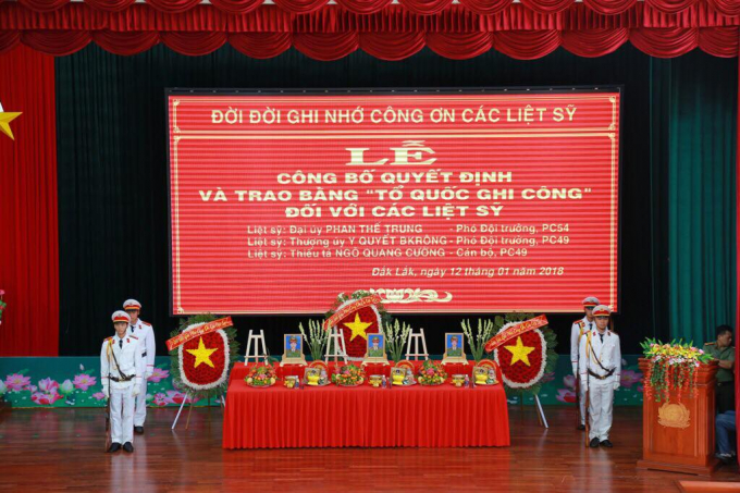 3 liệt sĩ được công bố quyết định và trao bằng Tổ quốc ghi công gồm: Đại úy Phan Huy Trung (SN 1986, cán bộ Phòng Kỹ thuật hình sự), Thiếu tá Ngô Quang Cường (SN 1984) và Thượng úy Y Quyết Buôn Krông (SN 1987), nguyên cán bộ Phòng Cảnh sát môi trường thuộc lực lượng Công an tỉnh Đắk Lắk.