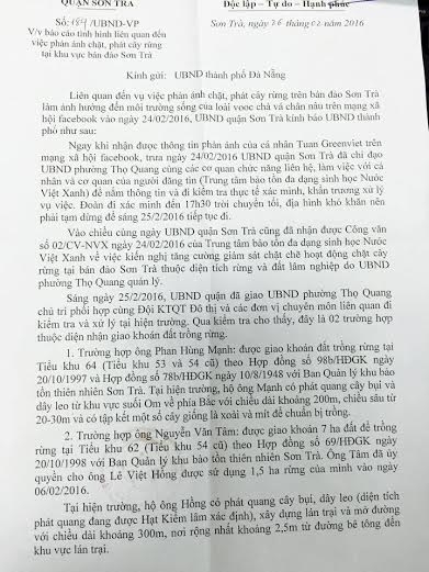 Vào chiều cùng ngày UBND quận Sơn Trà cũng đã nhận được Công văn số 02/CV-NVX ngày 24/2/2016 của Trung tâm bảo tồn đa dạng sinh học Nước Việt Xanh về việc kiến nghị tăng cường giám sát chặt chẽ hoạt động chặt cây rừng tại bán đảo Sơn Trà thuộc diện tích rừng và đất lâm nghiệp do UBND phường Thọ Quang quản lý.