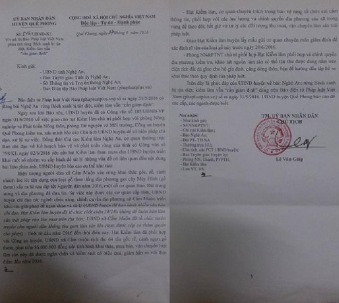 Theo đó, UBND huyện Quế Phong cho biết, ngay sau khi Pháp luật Plus đăng tải thông tin này, ngày 1/6/2016, UBND huyện này đã có công văn giao hạt Kiểm lâm chủ trì phối hợp với phòng Nông nghiệp và Phát triển Nông thôn, phòng Tài nguyên và Môi trường, Công an huyện Quế phong kiểm tra, xác minh và xử lý sự việc.