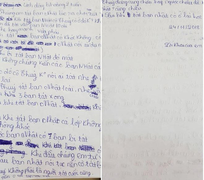 Báo cáo có đoạn: “Chiều 24/11/2018 nhà trường đã điều tra học sinh bằng phiếu điều tra. Kết quả phiếu lấy ý kiến từ 23 học sinh như sau: Sự việc xảy ra học sinh bị các bạn tát 231 cái tát là có thật nhưng trong đó có 13 em tát nhẹ, 8 em tát vừa, 2 em tát mạnh. Cô Thủy có chứng kiến 1 bạn tát sau đó mới rời khỏi lớp (11/23 em trả lời), 1 em trả lời chứng kiến 4 bạn tát, 1 em trả lời chứng kiến 3 bạn tát, 3 em không để ý).