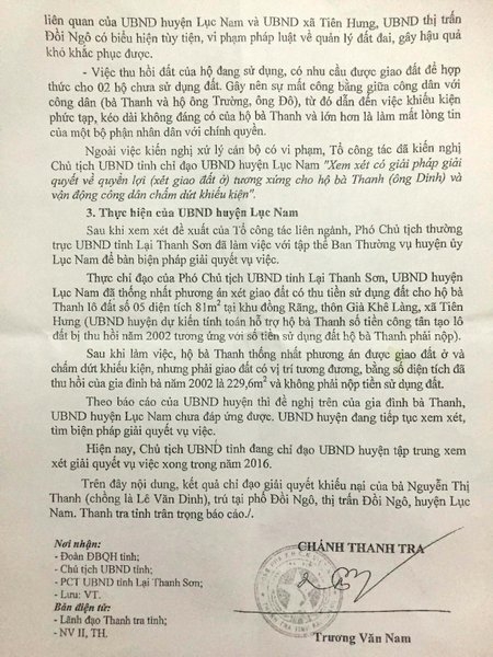 Báo cáo nêu rõ: “Từ việc xử lý hộ bà Nguyễn Thị Thanh (chồng là ông Lê Văn Dinh) lấn chiếm đất, đến việc hợp thức hóa quyền sử dụng đất ở (diện tích thu hồi của hộ bà Thanh) để cấp GCNQSD đất cho hộ ông Trường, ông Đô và việc tạm thu GCN, việc làm thủ tục cho ông Đô sau đó là các hộ chuyển nhượng đất của các cơ quan chức năng có liên quan của UBND huyện Lục Nam và UBND xã Tiên Hưng, UBND thị trấn Đồi Ngô có biểu hiện tùy tiện, vi phạm pháp luật về quản lý đất đai, gây hậu quả khó khắc phục được.