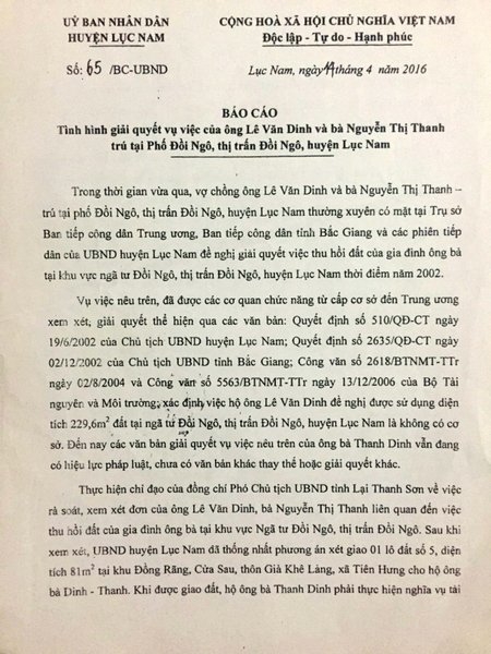 Điển hình đó là báo cáo số 65/BC – UBND do ông Giáp Văn Ơn – Phó chủ tich UNBD huyện Lục Nam ký ngày 14/4/2016 gửi UBND tỉnh Bắc Giang về tình hình giải quyết vụ việc của vợ chồng ông Dinh. Theo đó, mặc dù UBND huyện Lục Nam cho rằng ông Lê Văn Dinh không có cơ sở để đòi sở hữu mảnh đất 229,6m2 tại ngã tư thị trấn Đồi Ngô nhưng thực hiện sự chỉ đạo của ông Lại Thanh Sơn – Phó CT UBND tỉnh Bắc Giang thì UBND huyện Lục Nam đã ra phương án xét giao một lô đất có diện tích 81m2 ở địa điểm khác cho gia đình ông Dinh do hai vợ chồng “thường xuyên” có mặt tại trụ sở tiếp công dân các cấp, để phản ánh về việc thu hồi đất của gia đình(?!).