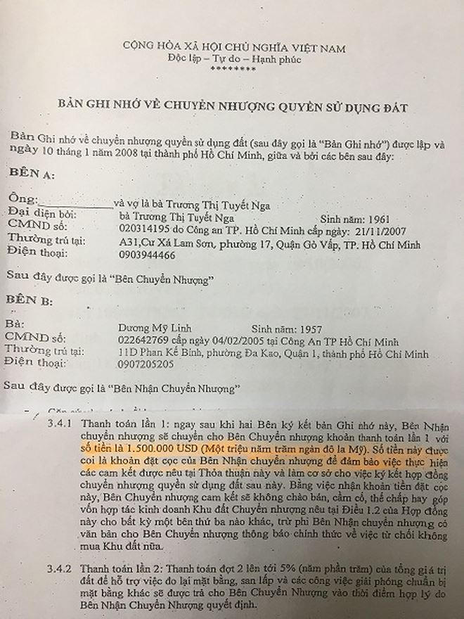 Đến ngày 1/2/2008, các bên thoả thuận nâng số tiền đặt cọc lên 1,5 triệu USD nên bà Linh có đưa thêm cho Nga 400.000 USD cho đủ. Chính vì vậy, tại phần cuối của “Bản ghi nhớ về chuyển nhượng quyền sử dụng đất”, Nga có ghi là “tôi có nhận 1.500.000 USD”. Đây cũng là số tiền Nga đã nhận tính đến ngày 1/2/2008 chứ không phải số tiền nhận riêng trong ngày 1/2/2008 như cách hiểu của HĐXX.