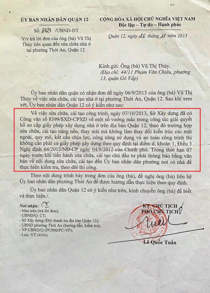 Trước hướng dẫn của UBND quận 12, ngày 11/12/2013, bà Thúy đã làm đơn thông báo về nội dung sửa chữa cải tạo nhà gửi UBND phường Thới An kèm theo bản vẽ thiết kế kết cấu công trình bà Thúy sẽ sửa chữa cải tạo để địa phương kiểm tra theo dõi.