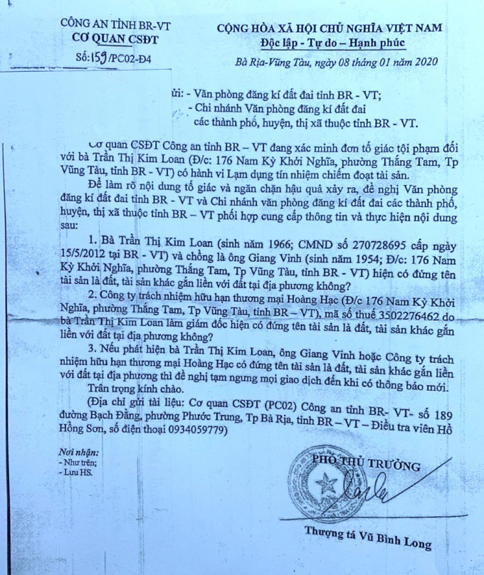 Xin trở lại mốc thời gian tháng 1/2020, khi Cơ quan Cảnh sát điều tra - Công an tỉnh Bà Rịa - Vũng Tàu gửi Văn bản tới Văn phòng Đăng ký đất đai tỉnh Bà Rịa - Vũng Tàu; Chi nhánh Văn phòng đăng ký đất đai các thành phố, huyện, thị xã thuộc tỉnh Bà Rịa - Vũng Tàu. Văn bản số 159/PC02-Đ4 có nêu: "Để làm rõ nội dung tố giác và ngăn chặn hậu quả xảy ra, đề nghị Văn phòng đăng ký đất đai tỉnh Bà Rịa - Vũng Tàu và Chi nhánh văn phòng đăng ký đất đai các thành phố, huyện, thị xã thuộc tỉnh Bà Rịa - Vũng Tàu phối hợp cung cấp thông tin và thực hiện nội dung…