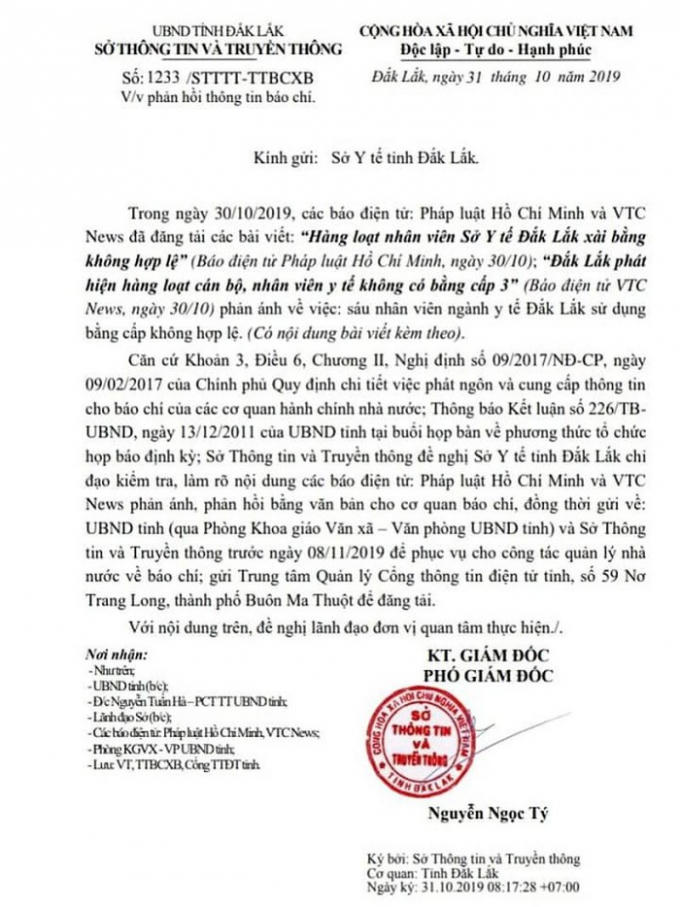 Trong ngày 30-10, PLO có đăng tải bài viết "Hàng loạt nhân viên Sở Y tế Đắk Lắk xài bằng không hợp lệ". Đến ngày 1-11, Sở TT&TT có văn bản phản hồi báo chí, đề nghị Sở Y tế chỉ đạo kiểm tra, làm rõ nội dung mà PLO đã đăng, thông tin bằng văn bản cho cơ quan báo chí, gửi cho UBND tỉnh và Sở TT&TT trước ngày 8-11-2019.