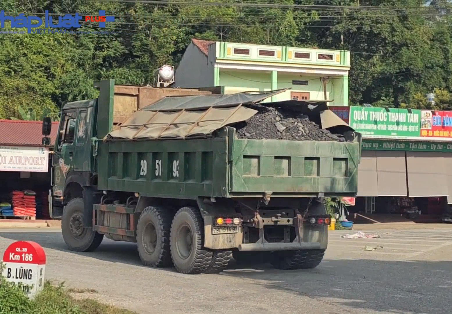 Quan sát bằng mắt thường có thể thấy rõ, tất cả các xe trong đoàn đều chở cùng một chất liệu màu đen xám như nhau và được đổ đầy tràn thùng xe vun cao có ngọn, gần gấp đôi sức chứa của thành thùng.