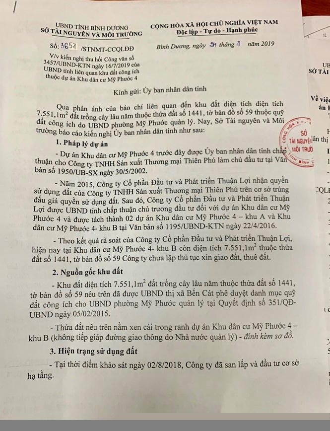 Sau đó, ngày 16/7/2019, UBND tỉnh Bình Dương có Công văn 3457/UBND- KTN chấp thuận theo đề nghị của Sở TNMT về việc thu hồi đất, giao đất công trên cho Công ty Thuận Lợi thực hiện dự án.