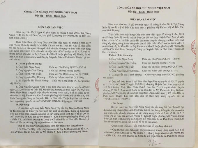 Biên bản làm việc giữa cơ quan chức năng và Công ty Thuận lợi, trước khi công ty này mang đất công bán.