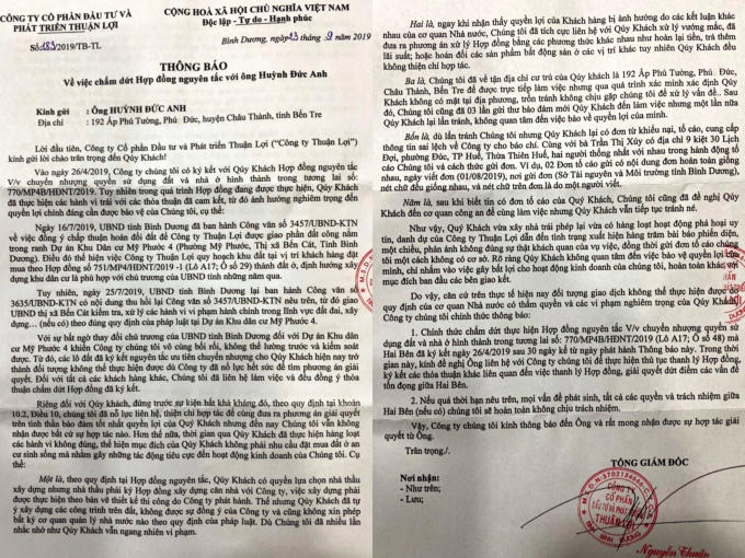 Ngày 23/9, Công ty Cổ phần Đầu tư và Phát triển Thuận Lợi (Công ty Thuận Lợi) đã có Thông báo số 183/2019/TB-TL và 184/2019/TB-TL về việc chấm dứt Hợp đồng nguyên tắc với ông Trần Đức Anh (ngụ tỉnh Bến Tre) và bà Trần Thị Xúy (ngụ tỉnh Thừa Thiên Huế). Thông báo này cho biết, trong quá trình đang thực hiện Hợp đồng, khách hàng đã thực hiện các hành vi trái với các thỏa thuận đã cam kết, từ đó ảnh hưởng nghiêm trọng đến quyền lợi chính đáng cần được bảo vệ của công ty.