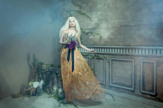 Khung cảnh là bức tường cổ bị cây lá mọc phủ đầy, thấp thoáng là chú thỏ trắng và chim hồng hạc đã tạo nên bức tranh cổ tích đầy huyền ảo ở xứ sở sương mù. Với lối trang điểm tôn lên nét đẹp tự nhiên, nhẹ nhàng của Hoàng Oanh, thoạt nhìn, cô gái ấy có vẻ mong manh, yếu đuối nhưng sâu bên trong cũng ẩn chứa chân dung của một người phụ nữ mạnh mẽ, đang lớn lên từng ngày qua từng trải nghiệm của cuộc sống.