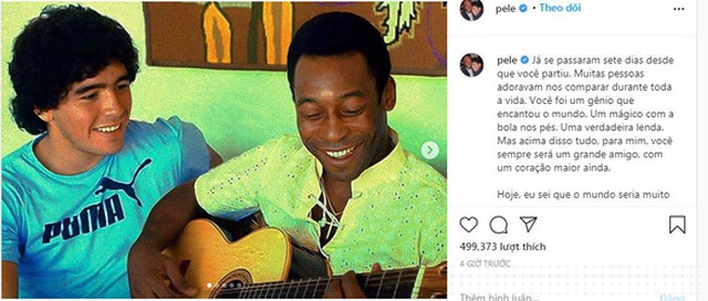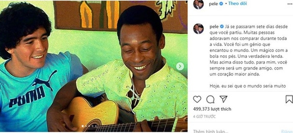 Nếu như Argentina có Maradona thì Brazil có Pele. Đã có rất nhiều sự so sánh giữa hai huyền thoại này, tuy nhiên cuộc tranh cãi ai giỏi hơn ai vẫn chưa bao giờ có hồi kết. Tuy nhiên, với bản thân Pele, ông chưa bao giờ tự nhận mình giỏi hơn Maradona, và mới đây ông càng gây xúc động khi chia sẻ bức tâm thư trên trang Instagram có 4,9 triệu người theo dõi của mình để tưởng nhớ Maradona.
