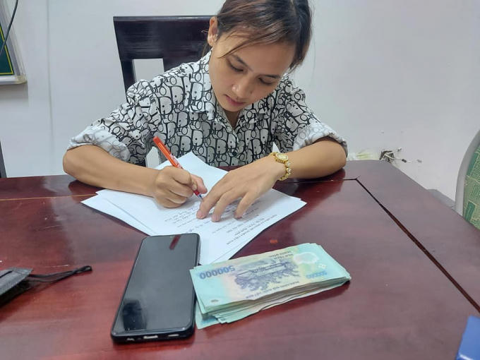 Nguyễn Thị Hiền cùng tang vật tại cơ quan điều tra.