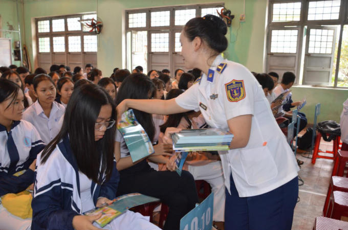 Cán bộ Vùng Cảnh sát biển 2 tuyên truyền, phát tờ tơi cho học sinh.