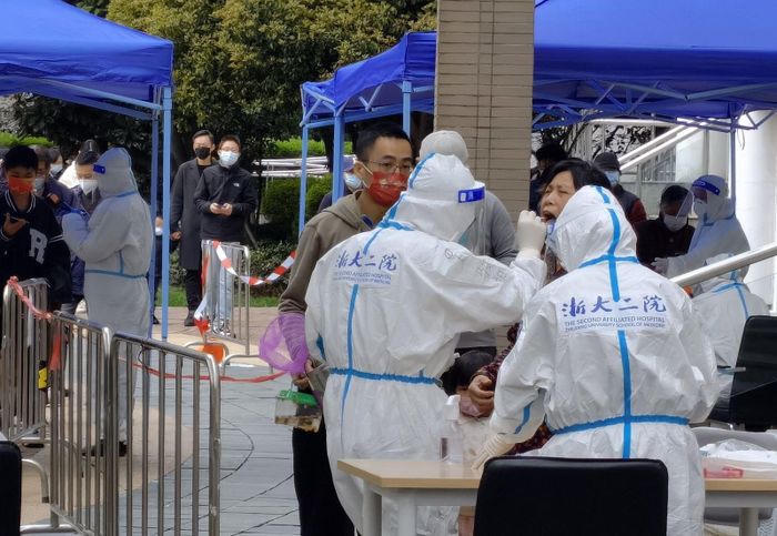 Nhân viên y tế lấy mẫu xét nghiệm COVID-19 cho người dân tại Thượng Hải, Trung Quốc, ngày 28/3/2022. Ảnh: THX/TTXVN