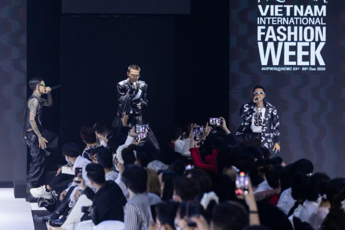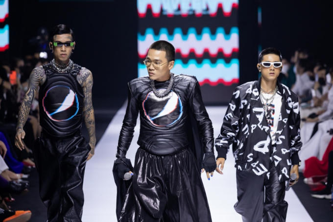 Quán quân Rap Việt Dế Choắt cùng Á quân Lăng LD và Wowy mang đến những giai điệu sôi động với màn “rap nối rap” ấn tượng trên sàn runway.