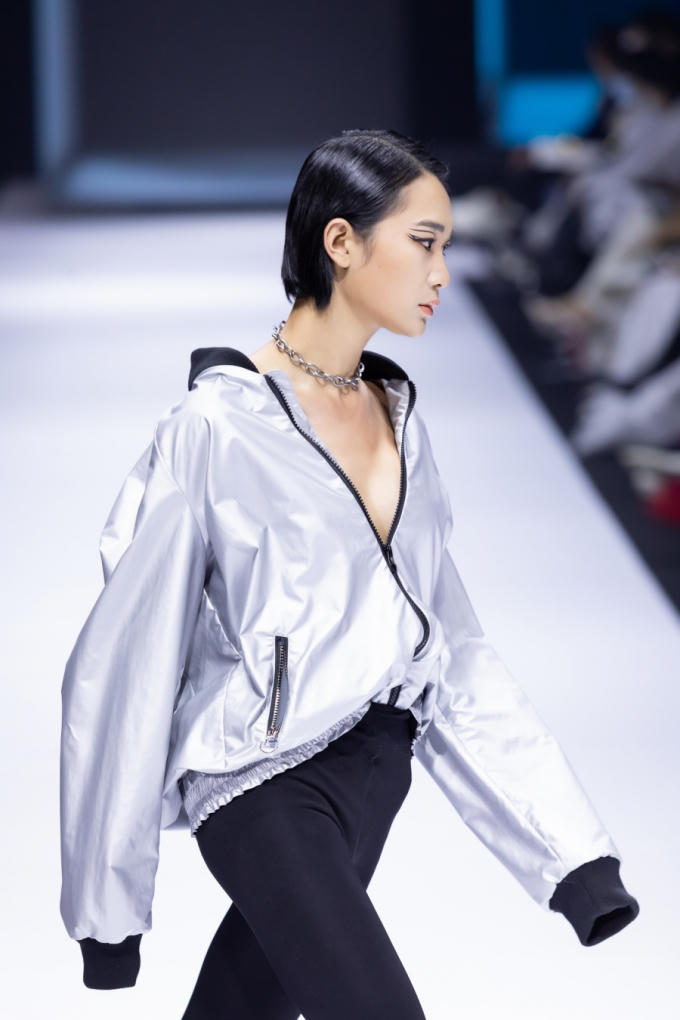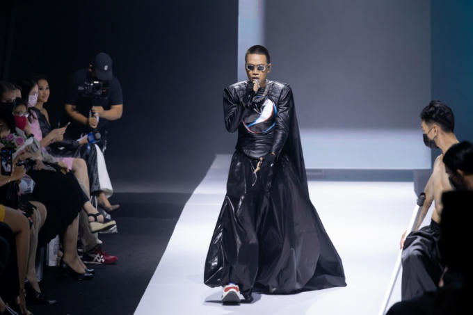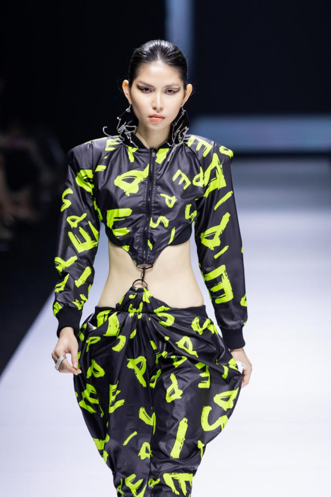 Sau đó, đội hình ba rapper đã sải bước dọc theo sàn catwalk hình chữ U. Không chỉ có mạch trình diễn thay đổi, ngôn ngữ thời trang ở giai đoạn này cũng chuyển biến với những nhấn nhá phá cách hơn, nhường chỗ cho những sáng tạo mang đậm bản ngã NTK xuất hiện. Các kiểu áo khoác phom rộng, tay cocoon được chần bông cầu kỳ, swimsuit lần lượt xuất hiện.