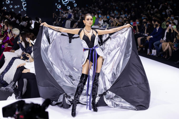 Siêu mẫu Võ Hoàng Yến chốt màn cùng vai trò vedette trong bộ cánh quyến rũ, khoe đôi chân dài thẳng tắp mang âm hưởng phi hành gia cùng tấm dù bay ánh bạc, hút mắt người nhìn.