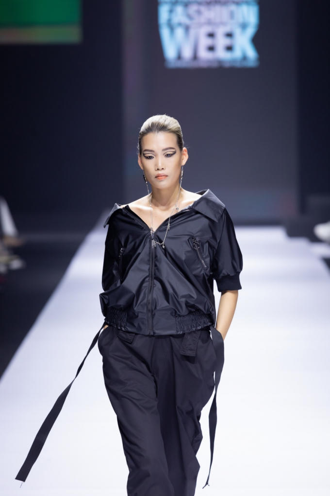 Nhà thiết kế sử dụng những chất liệu khác nhau tạo nên các sắc độ đen từ bóng tới mờ, từ thô ráp tới tinh xảo, cùng các kỹ thuật may khối 3D. Đây cũng là BST mang ý nghĩa rất lớn với nhà thiết kế trẻ bởi được tổ chức vào đúng ngày sinh nhật của mình.