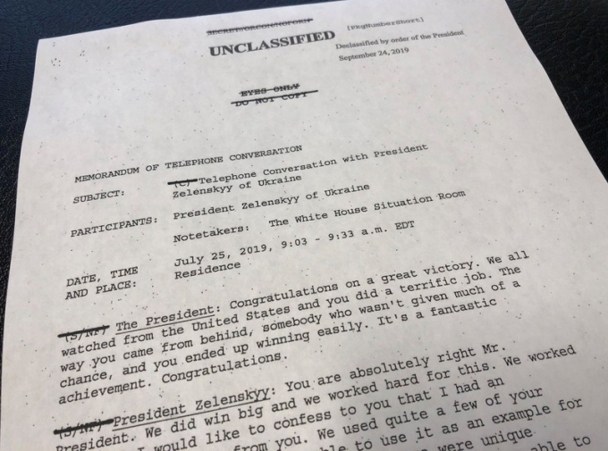 Bản ghi trên được công bố 1 ngày sau khi Chủ tịch Hạ viện Mỹ Nancy Pelosi thông báo Hạ viện do đảng Dân chủ chiếm đa số sẽ mở cuộc điều tra luận tội chính thức với ông Trump.