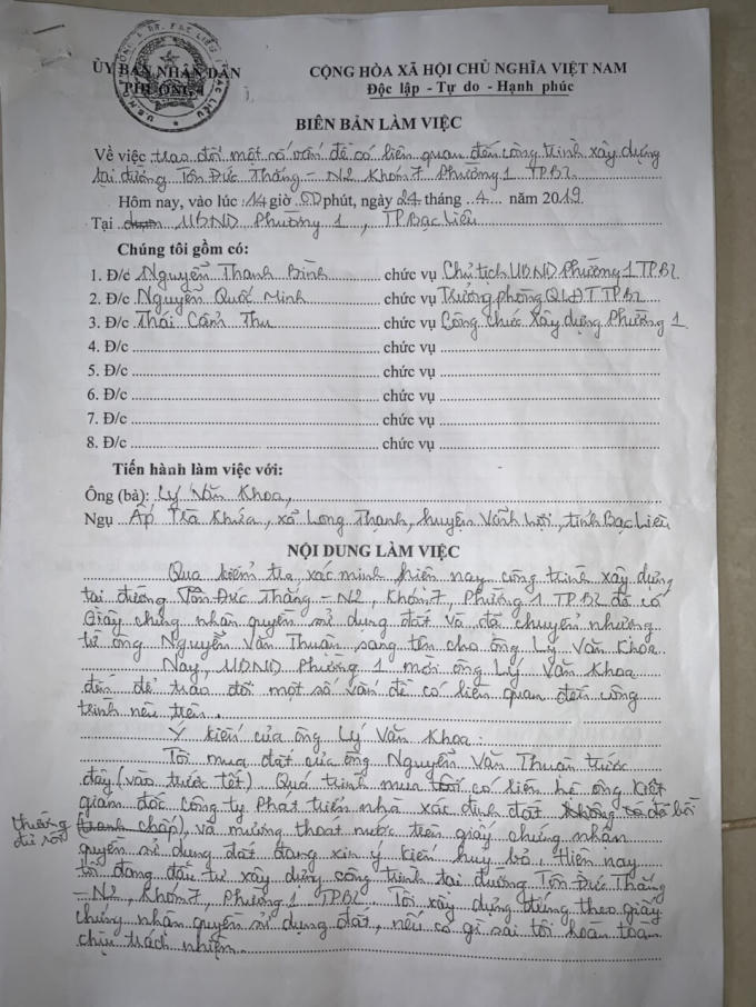 Theo biên bản làm việc giữa UBND phường 1 với ông Lý Văn Khoa, ông Khoa cũng thừa nhận mua đất của ông Thuận vào thời điểm trước tết, sau đó ông cho đầu tư xây dựng công trình.