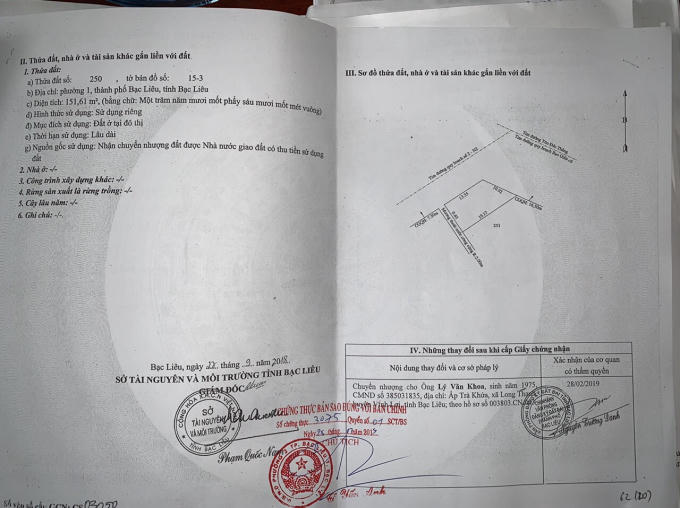 Có thể thấy, thửa đất số 250 tờ bản đồ số 15-3, diện tích 151,61m2, có nguồn gốc sử dụng hợp pháp từ ông Thuận nhận chuyển nhượng và được Nhà nước cấp sổ đỏ ngày 27/9/2018; sau đó ông Thuận lại chuyển nhượng cho ông Lý Văn Khoa, hiện ông Khoa cũng có chủ quyền hợp pháp.
