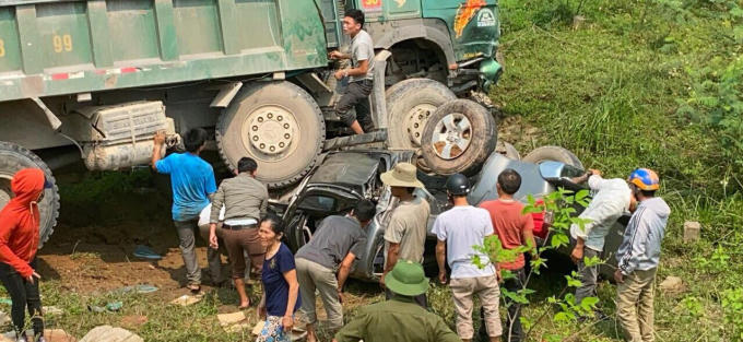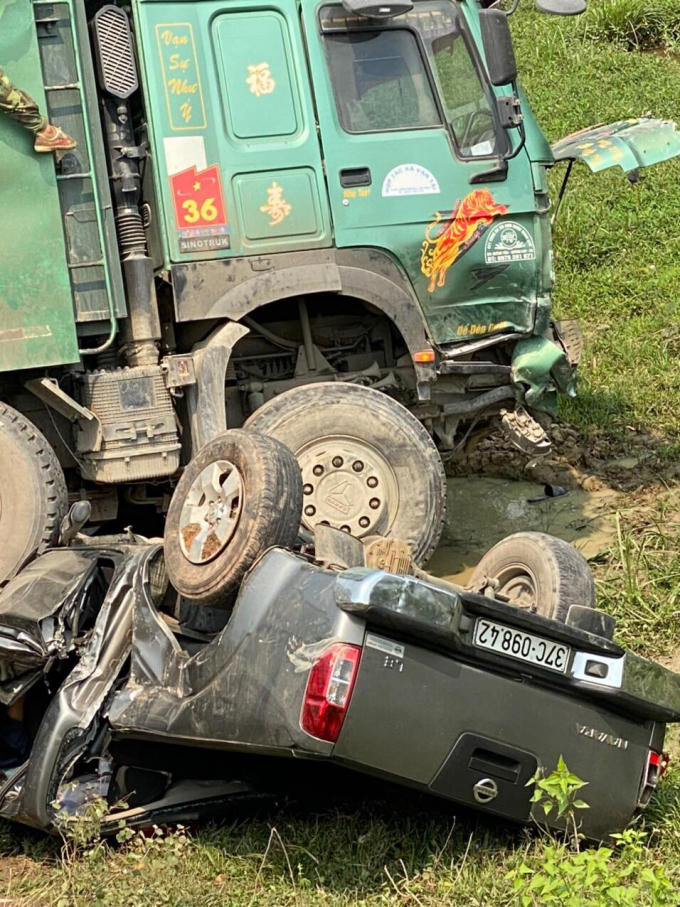 Cú đâm mạnh, khiến cả hai chiếc xe văng khỏi đường Hồ Chí Minh. Tại hiện trường, chiếc xe bán tải bị đâm bẹp, bị nhai nát bét, chiếc xe tải lớn lật nghiêng.