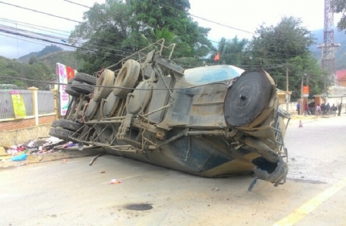 Xe trôi được khoảng 30m thì bị lật ngang, đè trúng anh Nguyễn Quang Hưng và em Lô Văn Tình (học sinh Trường THPT huyện Kỳ Sơn).
