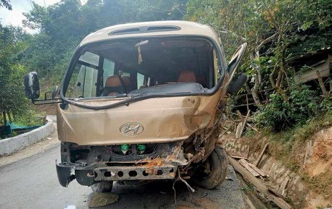 Sau khi lao vào vác núi, chiếc xe khách bị biến dạng phần đầu