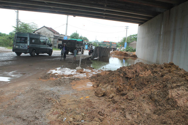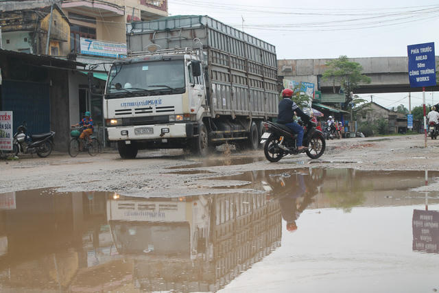 Ông Công cho biết, xe công trình vừa làm hư đường, vừa làm rơi vãi đất đá nên trời nắng thì bụi mù mịt, còn trời mưa đường quốc lộ còn thua đường làng.