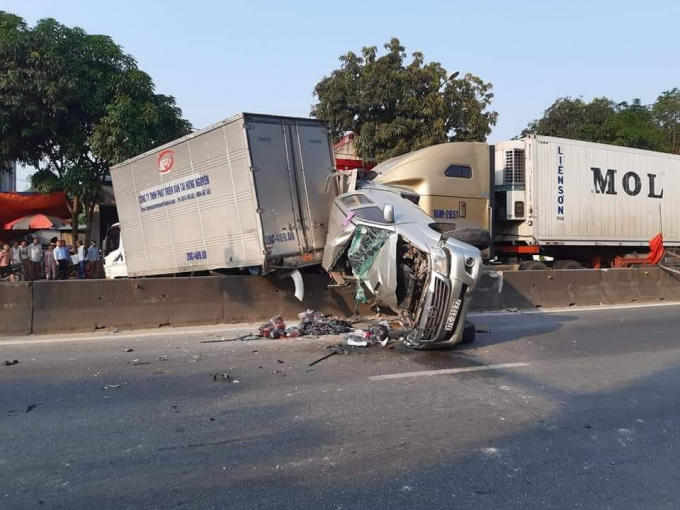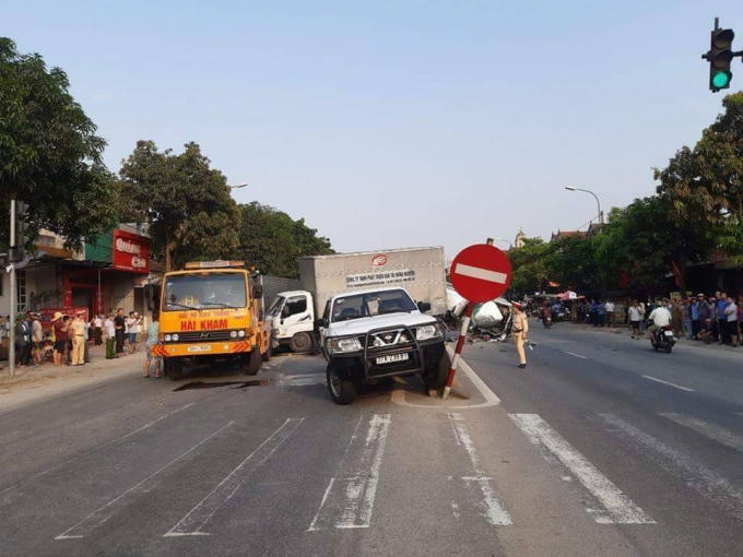 Lúc này, xe container BKS 16M-2851 kéo rơ moóc BKS 15R- 10504 bất ngờ lao đến, tài xế không làm chủ tốc độ tông thẳng vào đuôi xe bán tải BKS 37C- 21277 làm chiếc xe này tông vào xe tải 29C- 46908 rồi bay lên dải phân cách cứng của quốc lộ 1A.