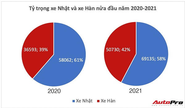 Với những thay đổi như vậy, thị phần xe Hàn Quốc trong 6 tháng đầu năm 2021 đã tăng lên đáng kể. Tổng doanh số 4 thương hiệu lớn của Nhật đều tăng nhưng không đủ để kéo lại thị phần.