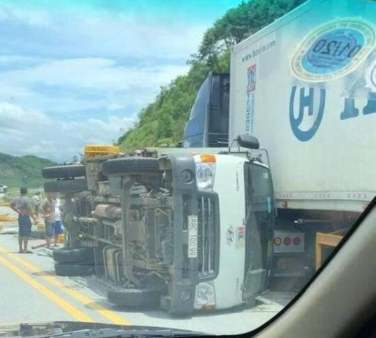 Chiếc xe tải chở gia cầm lật nghiêng. Ảnh: Lao Cai online