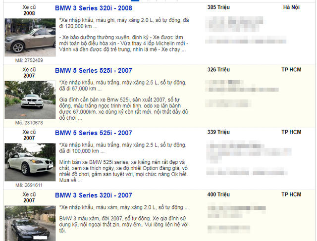 Một chiếc BMW 320i đời 2008 được chủ bán ra với giá 385 triệu đồng, mức giá thỏa thuận có thể khoảng 370 - 380 triệu đồng, xe sử dụng 11 năm và đi 12 vạn km, dung tích xylanh 2,0L (mức tiêu thụ nhiên liệu dự kiến 10 lít/100km).