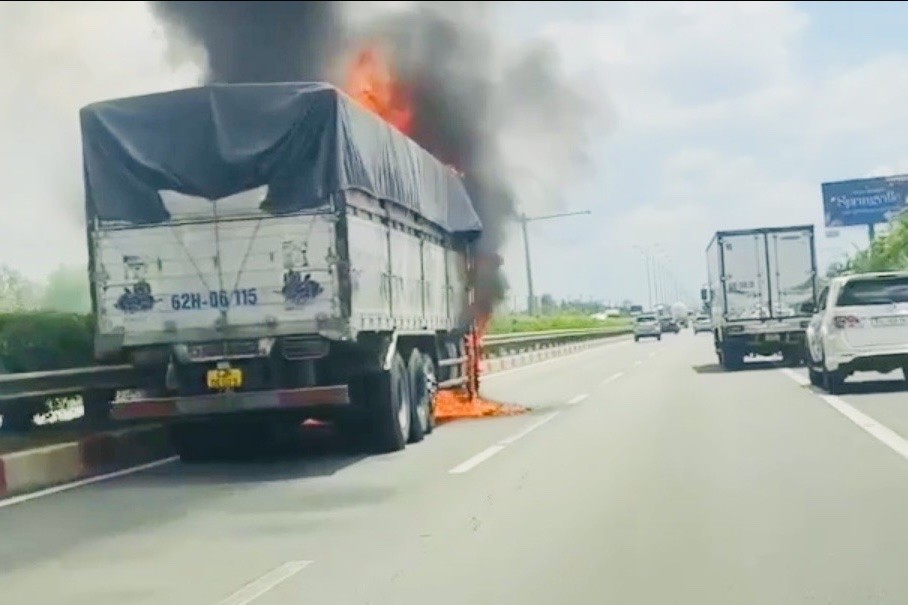 | Chiếc xe tải bốc cháy trên cao tốc TP HCM - Long Thành - Dầu Giây hướng đi Đồng Nai. |
